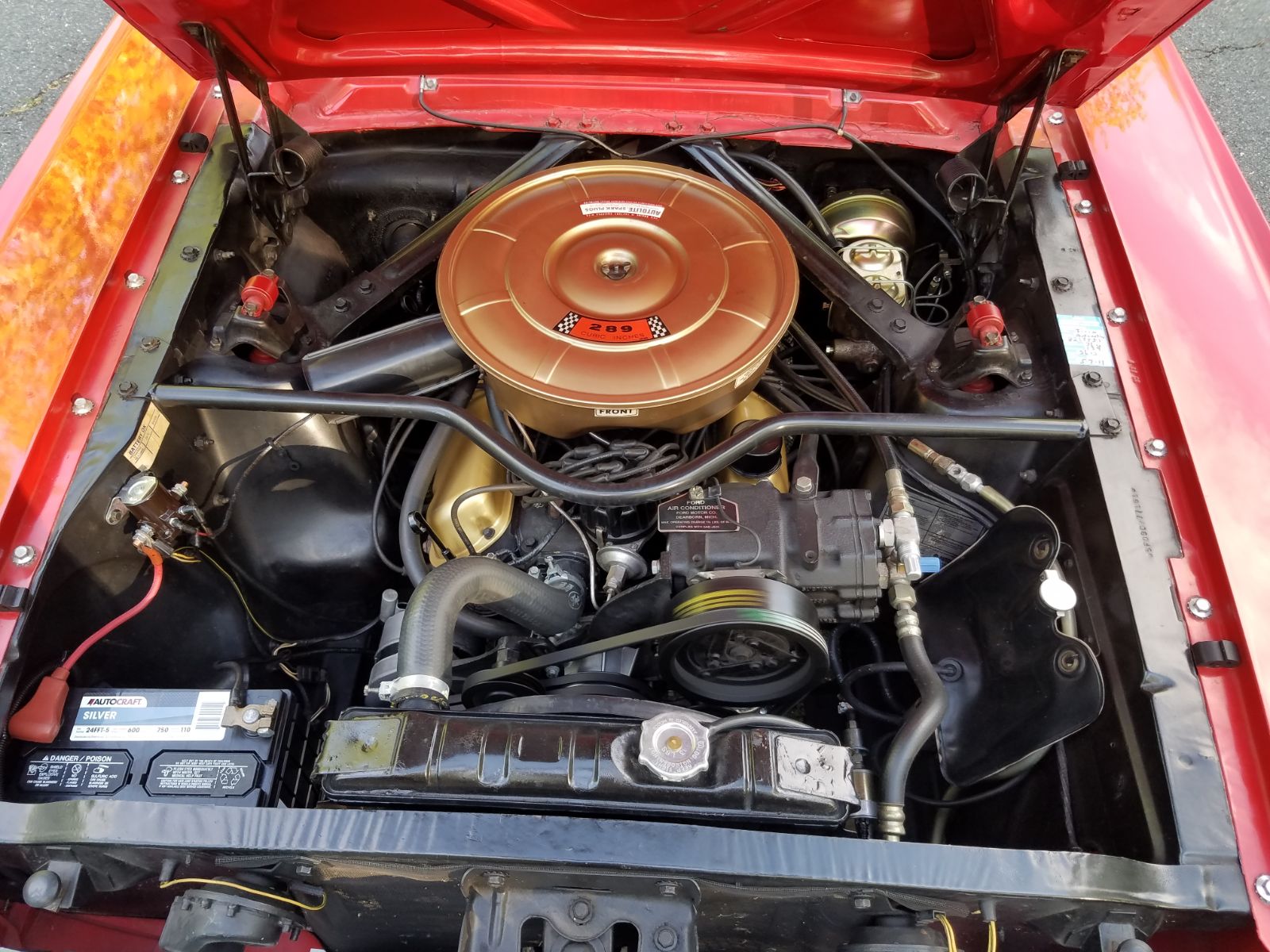 This is a VIN “C” code meaning it’s a 289 V8 from the factory with the original 2 barrel. It’s finished, restored, and ready to enjoy the moment it is yours.The paint color I believe is Rangoon Red, and is about 10 years old by my estimation and it looks beautiful. No dents scratches nor rust. Chrome is perfect. Door hood and trunk gaps are straight and even. Everything’s been kept as original looking as possible, and I point out the many correct details under the hood like the Ford branded radiator hose and correct hose clamps, correct valve covers, and various stickers and markings where they belong, just to name a few, some of which you can see in the photos. I like to view photos of concours winning cars to compare little details. The date code on the engine is correct for this car. The automatic transmission was professionally removed, rebuilt and re-installed approximately 2 years ago only to correct a leak at that time. The torque converter was replaced as well. All stock specs, it shifts and operates perfectly. The air conditioning blows cold and was professionally converted to modern R134 several years ago. In 2017 we replaced the starter, battery, and solenoid, as preventative maintenance. A couple years prior, we replaced the alternator, regulator, water pump, belts, thermostat, coolant, spark plugs, coil, ignition wires, again all just maintenance. We also added the idler pulley to the air conditioning belt as was done by Ford dealers back in the day for quieter operation. The brakes have been upgraded to the much safer two-circuit power assist, since the original in 65 is single circuit and the entire system fluid was replaced. Brake lines were all replaced a couple years prior as well. The original master cylinder is in a box and included. Floors and everything are solid. Underneath is a sight to behold too, and I encourage you to put it on a lift. It’s very clean, no rust, no holes, no rot, and no thick undercoating to hide anything. Tires are just a few years old and have nearly full tread remaining. The dual exhaust has a stock sound but with the V8 mustang rumble. Included in the trunk are a pair of brand new flowmaster mufflers still in the box, in case you want to increase the sound. Tires are just a few years old and should last a long time. Also including an extra Magnum wheel that matches the other 4, in new condition, and there’s another spare wheel and tire and jack in the trunk. We’re also including an aftermarket thick-rim steering wheel which we used until putting it back to the stock wheel. Interior - again it is all restored and the pictures speak for it. It looks as beautiful in person as it does in the pictures, all solid without any rattles while you drive. Glass is all clear, with no chips or scratches or fogging. Hand crank windows operate smoothly, corner vent windows open and close fine. All exterior and interior lights, gauges and equipment, including the AM radio, horn, turn signals, headlights, wipers, reverse lights, and anything I may have forgotten to mention, all works properly.